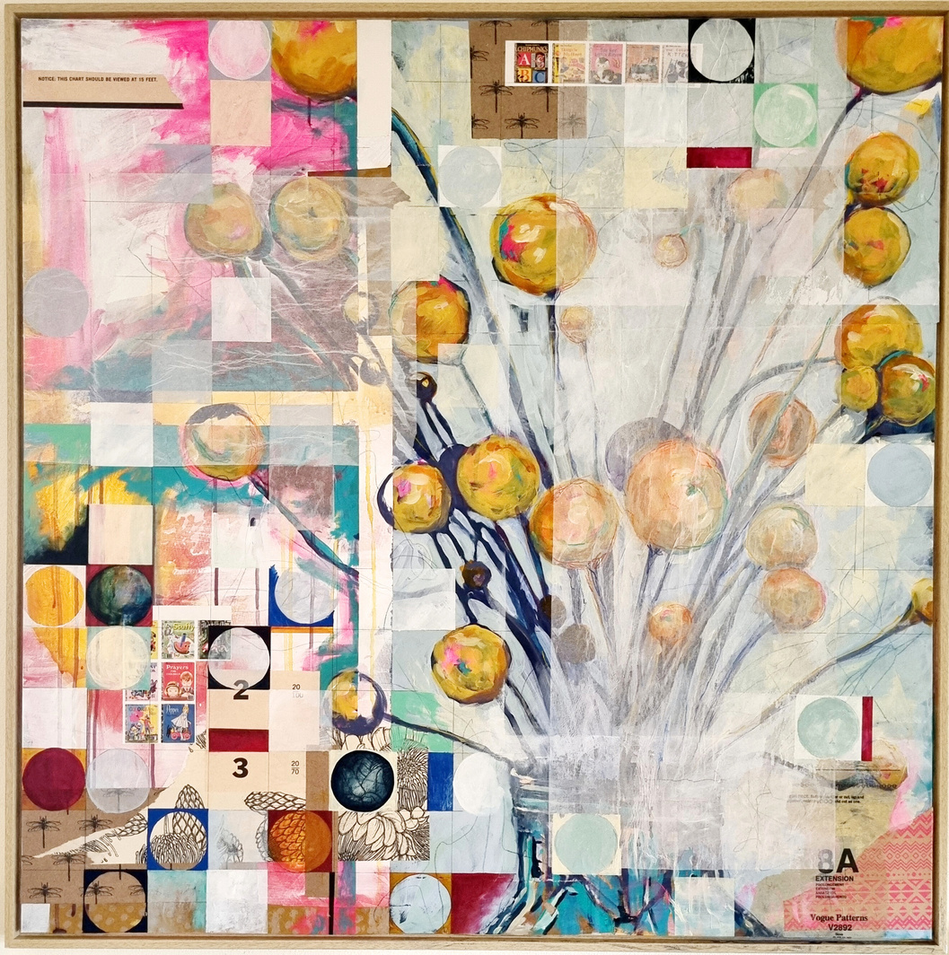 Billy Buttons + Dragonflies, 2023. Mixed media on canvas (Framed). 100 x 100cm (Private Collection)